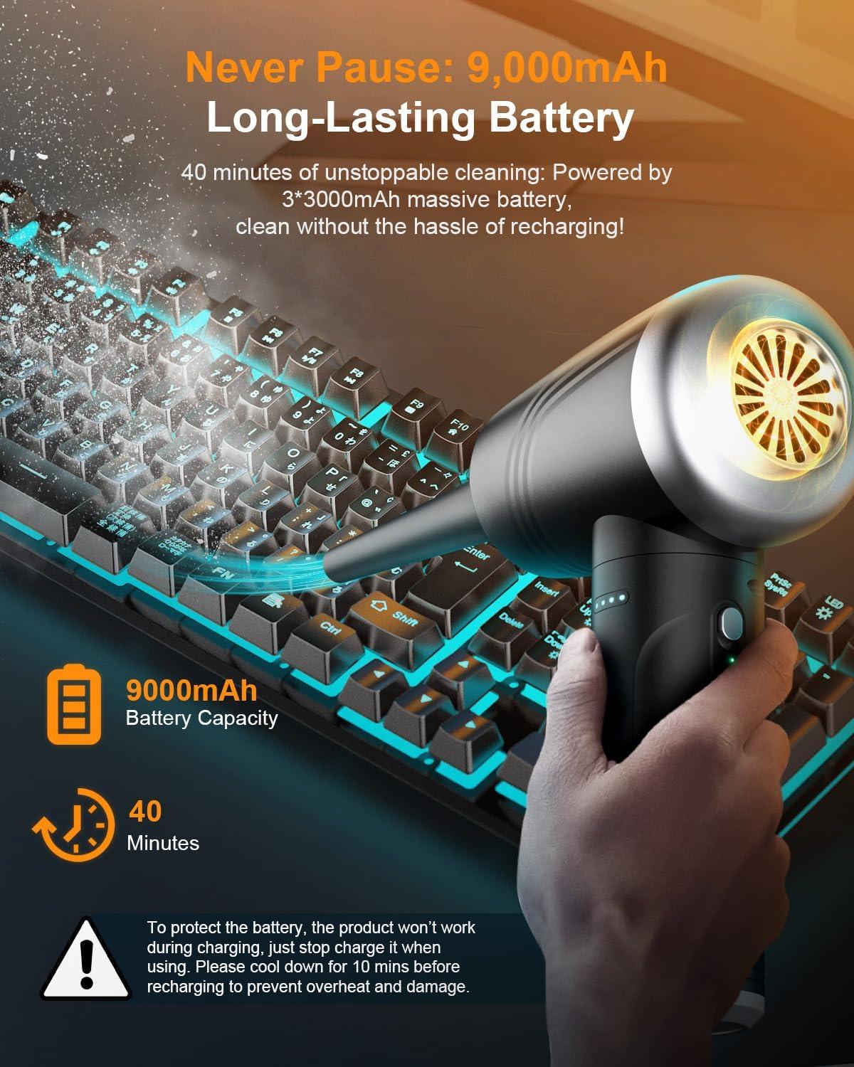 40Min Unmatched Endurance: Don't let a dead battery interrupt your cleaning spree. Our rechargeable air blower boasts a colossal 9,000mAh battery (3 x 3,000mAh cells) that delivers a staggering Max 40 minutes of cleaning power. No need to stress about recharging mid-session. Please full charge the device when the first use. (Note: To keep your electric air duster in top shape, let it cool for 10 minutes post-use before recharging.)