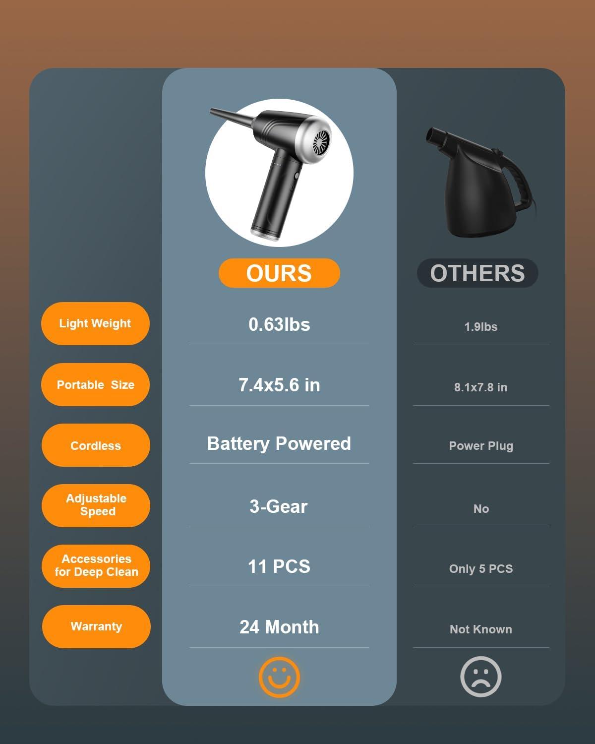 Lightweight & Hassle-Free Cleaning: Tired of lugging around heavy cleaning gear? Unlike bulky, wired air dusters weighing 1.9lbs, our portable pc duster for laptop weigh just 0.63lbs, perfect for one-handed cleaning. With 11 attachments included, no dusty nook goes uncleaned. Plus, enjoy peace of mind with our 24-month warranty.