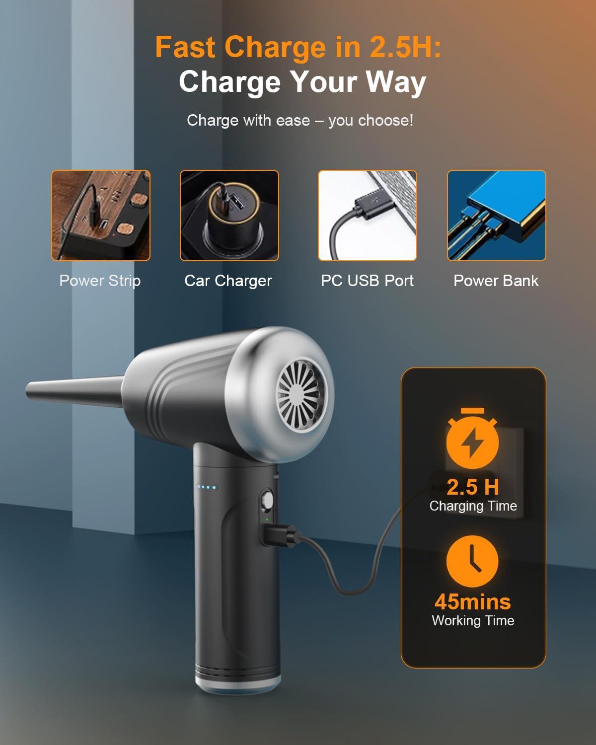 Charge Anywhere, Anytime: Convenience is key, and Bankky computer air duster delivers. Charge it effortlessly with the included 2A USB C-A data cable using wall sockets, car chargers, computer USB ports, or portable power banks. It's a speedy 2.5-hour recharge – always ready to bust some dust!