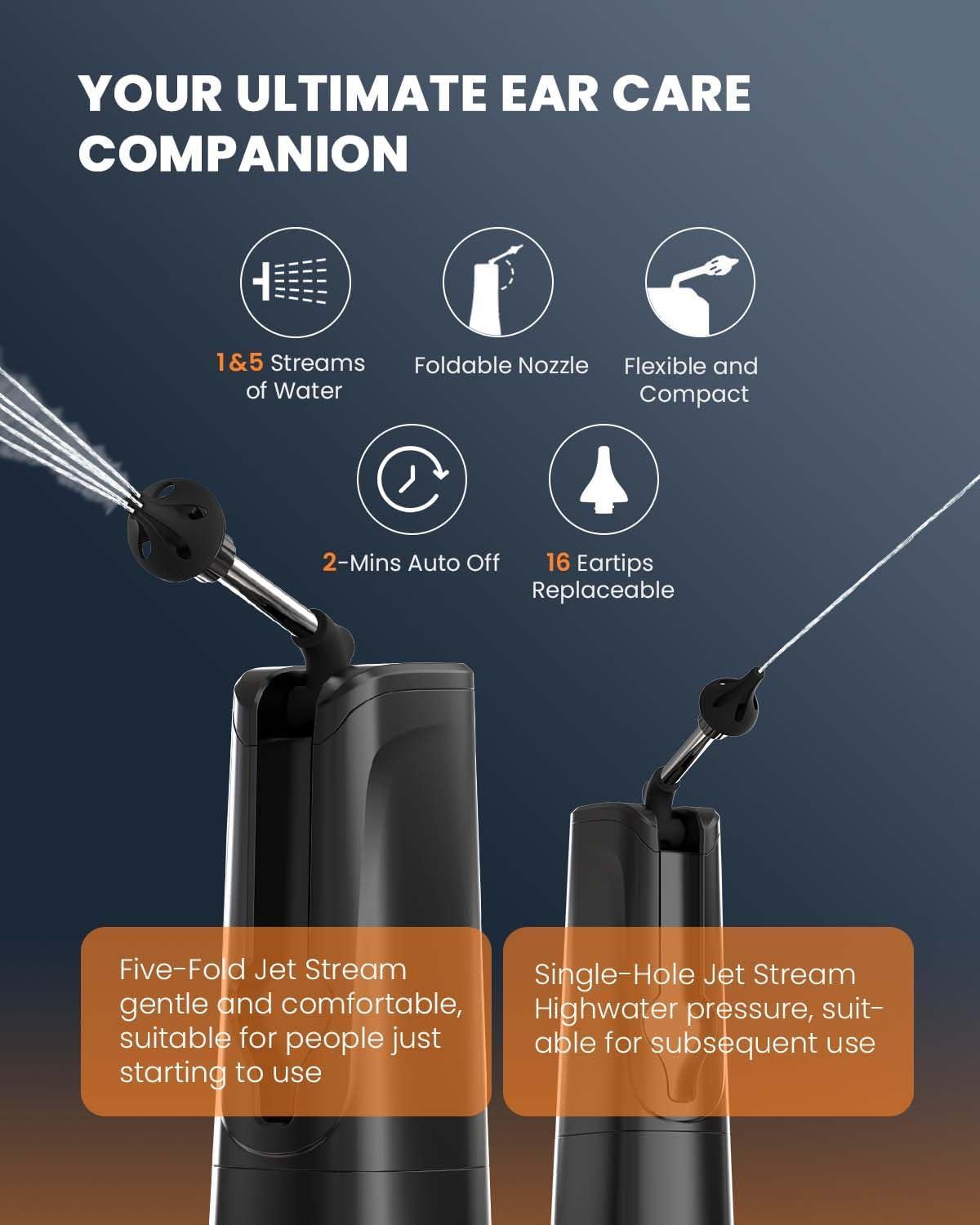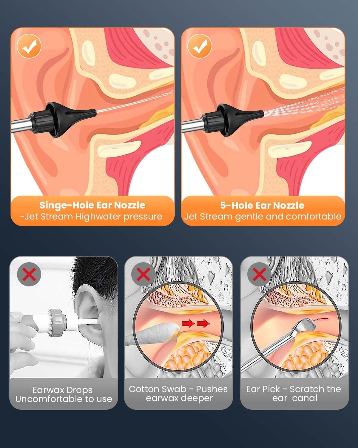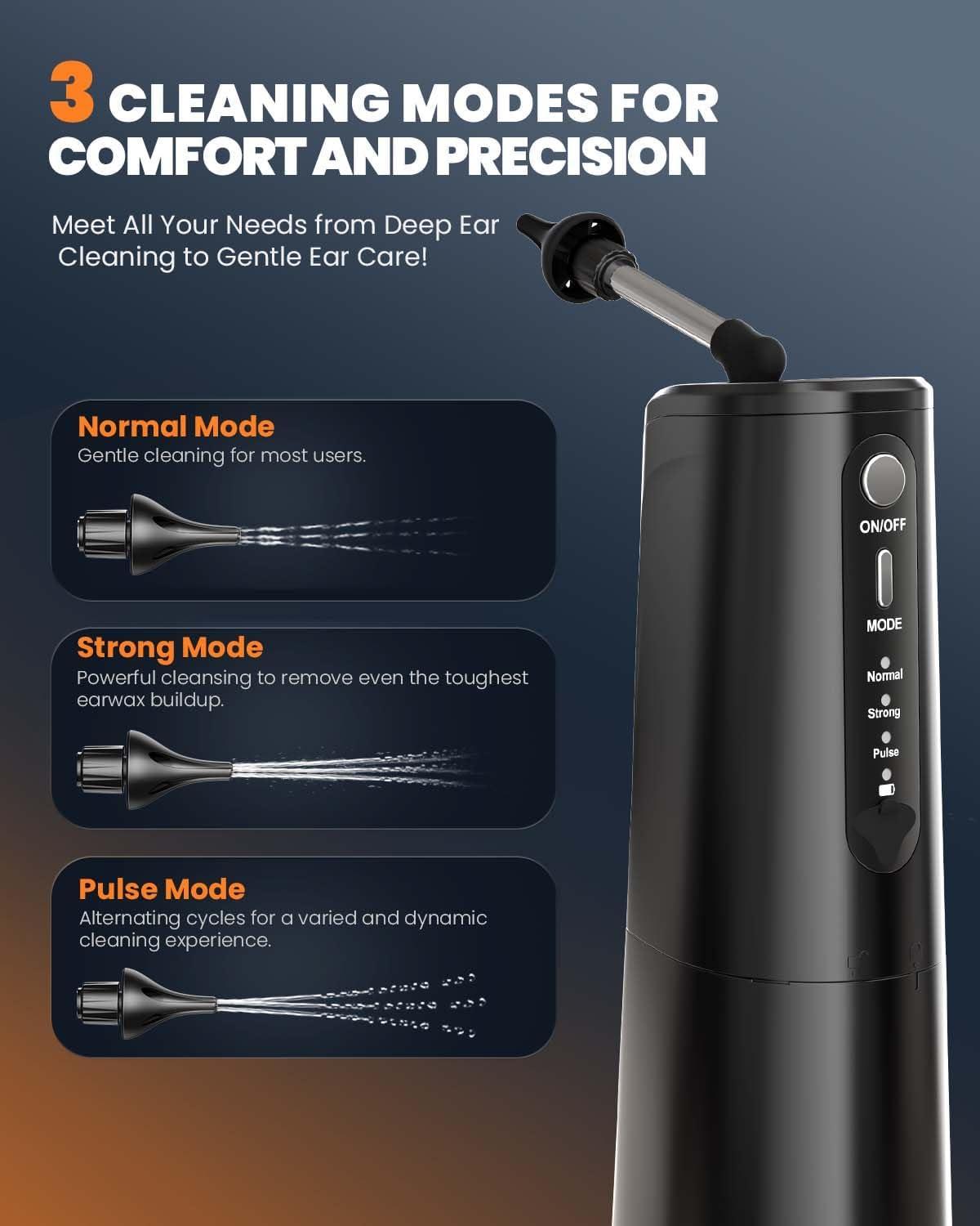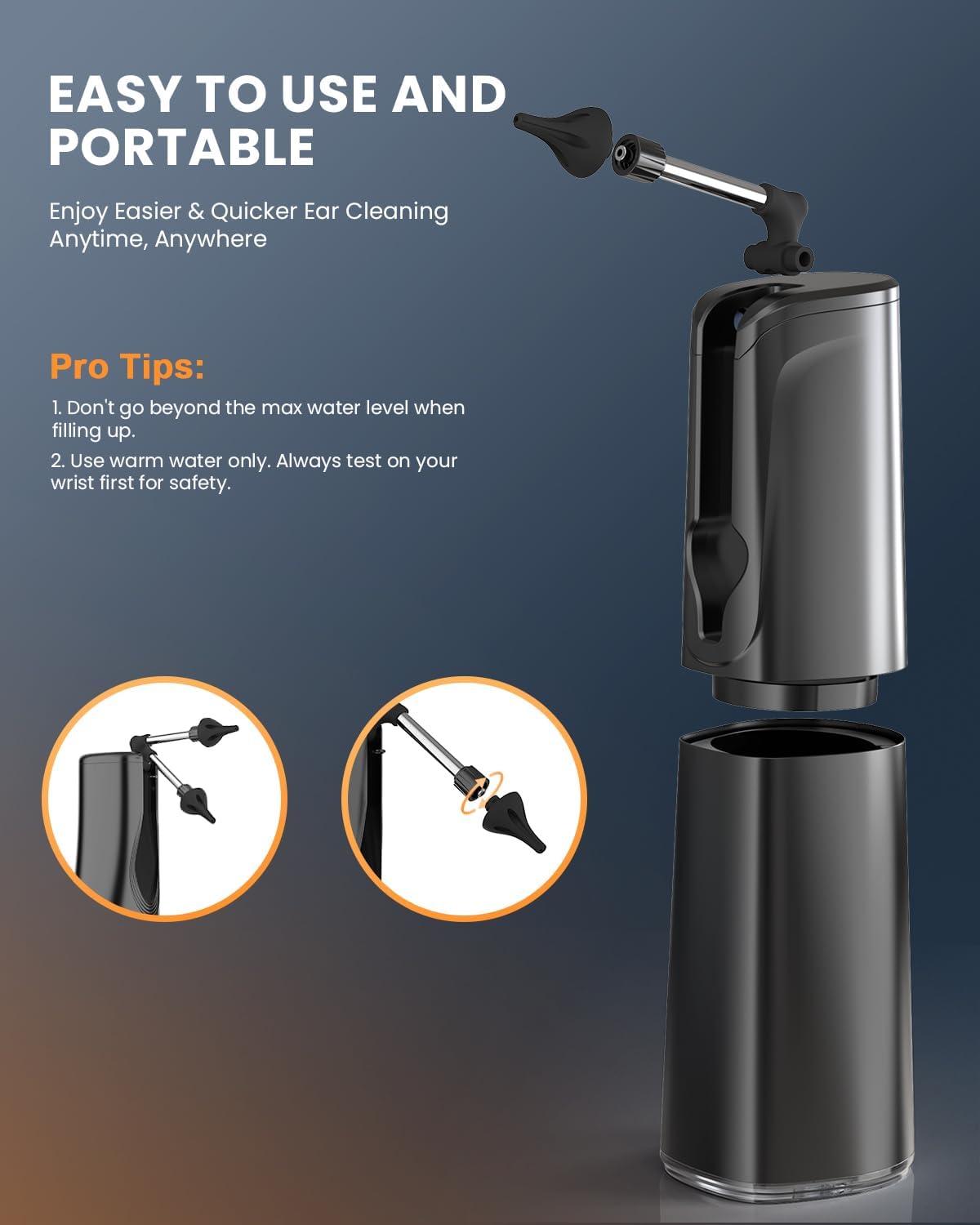 Ultimate Ear Wax Cleaner Kit: Ditch your traditional cotton swabs and ear picks and upgrade to our professional-grade electric ear wax removal. The 2000mAh capacity ear irrigation kit can be used for up to three hours and can last for more than two months on a single charge. With 350ml water tank, two different nozzles and three cleaning modes allow for thorough ear flush, while prevent ear infections. Say goodbye to discomfort and hello to fresh, energized ears!