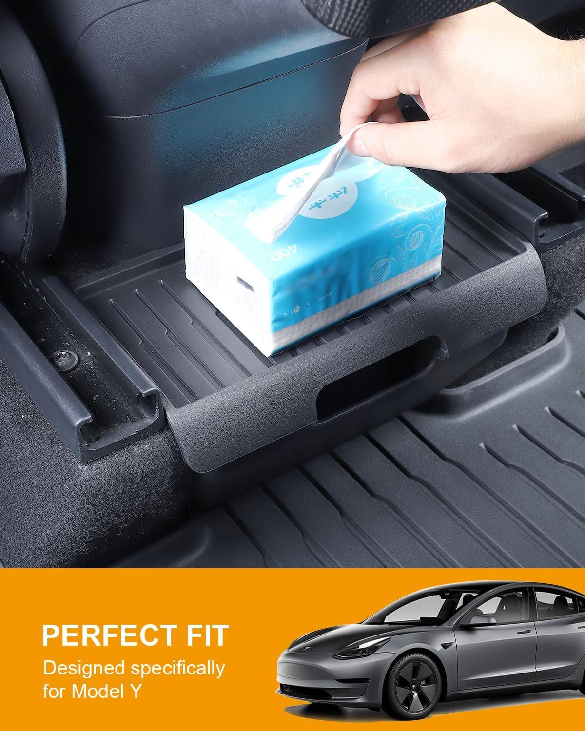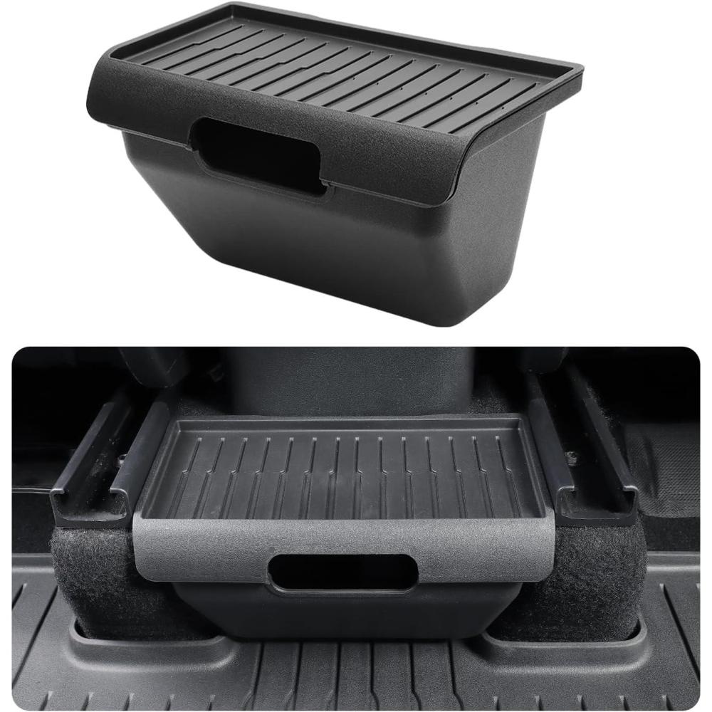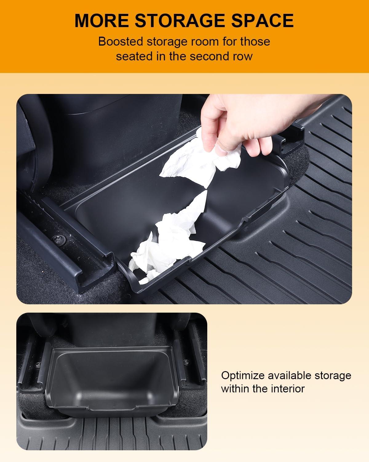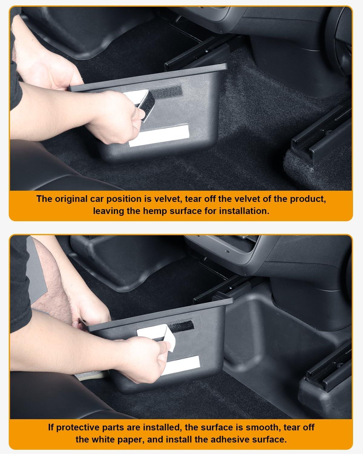 Effortless Installation: Say goodbye to complicated installations! Our under-seat storage for the Tesla Model Y requires no tools, making it easy to install. Just attach the velcro strap under the rear exhaust port, seamlessly integrating without limiting seat adjustment or foot extension. ❗ NOTE: velcro design which fit flocking surface of original, If you install a protector, you need to stick the self-contained double-sided tape in a dry and clean state, and wait for one day before placing heavy objects.